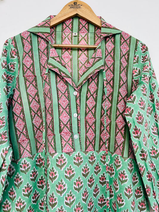 Green hand block printed cotton jumpsuit - Collared button-up jumpsuit