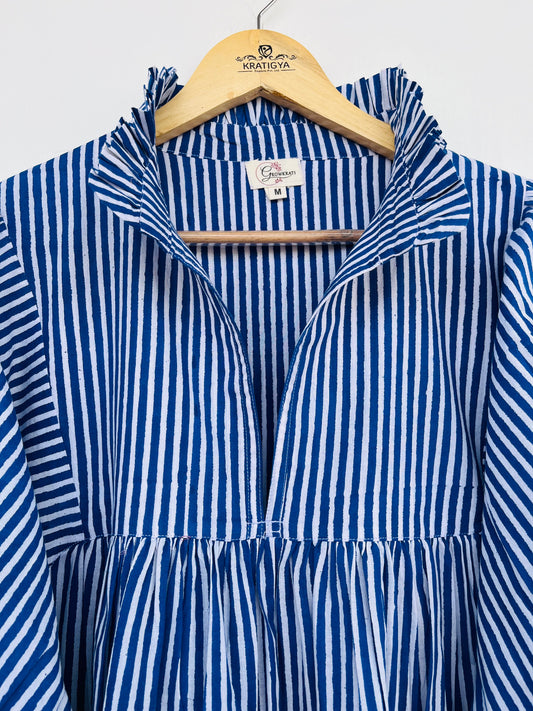 Blue Striped Cotton Maxi Dress with Ruffle Neck