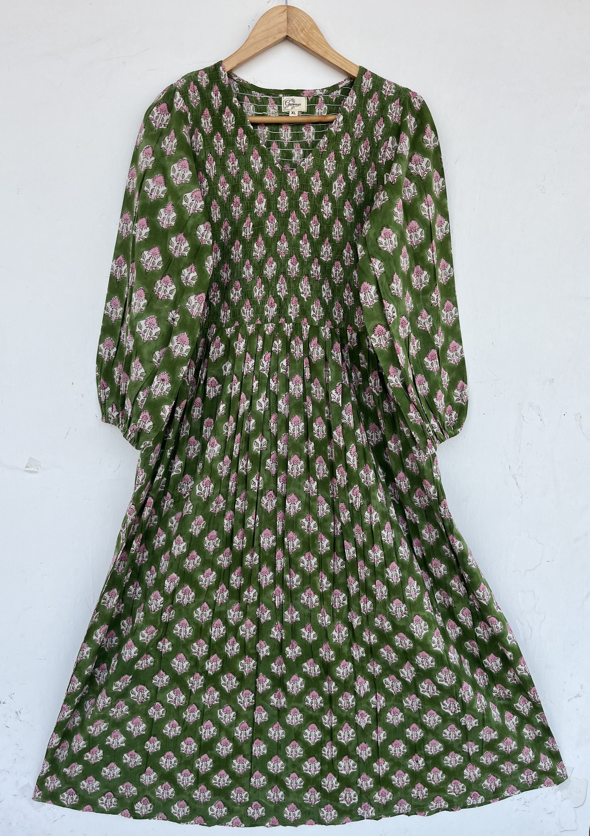 Green Floral Comfy Fit Long Maxi | V Neck Shirred Bodice Summer Dress